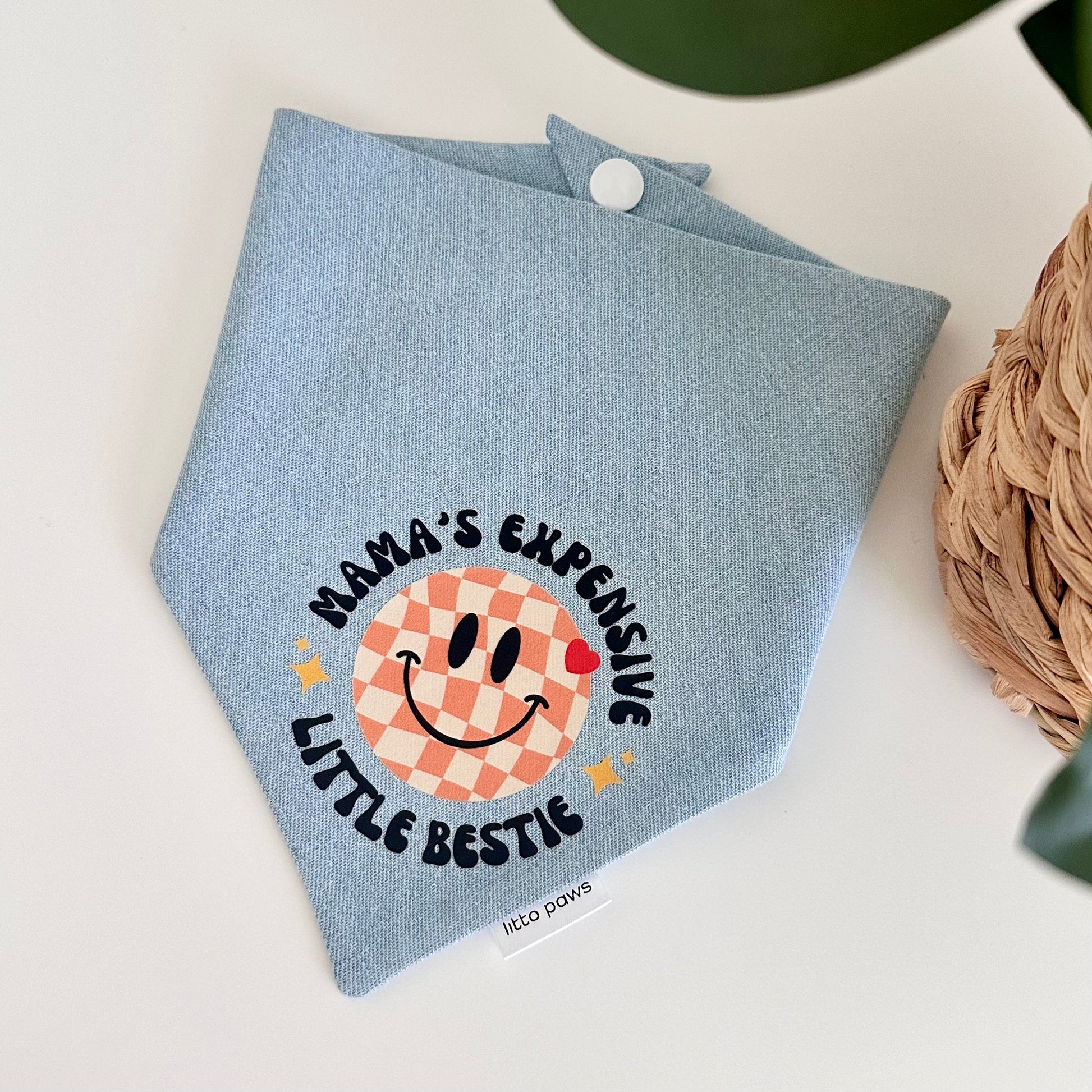Denim bandana with a snap on feature to securely keep the bandana in place. All our bandana's are handmade in the USA. All of our bandanas will come finished with a Litto Paws tag.