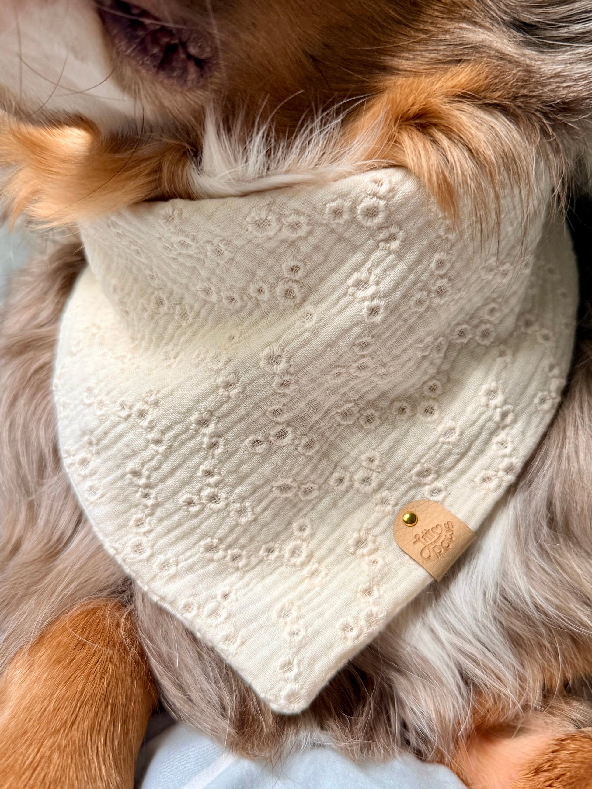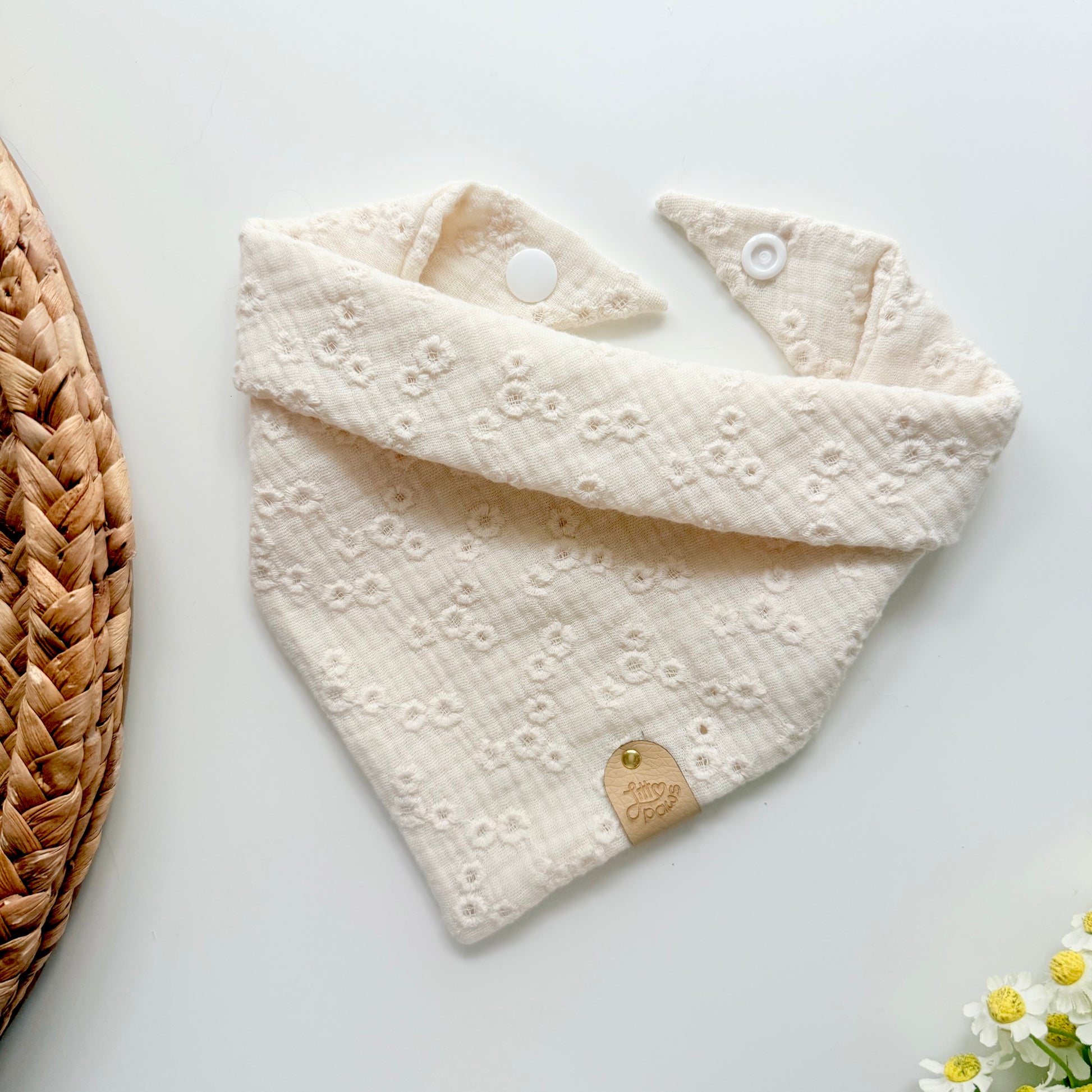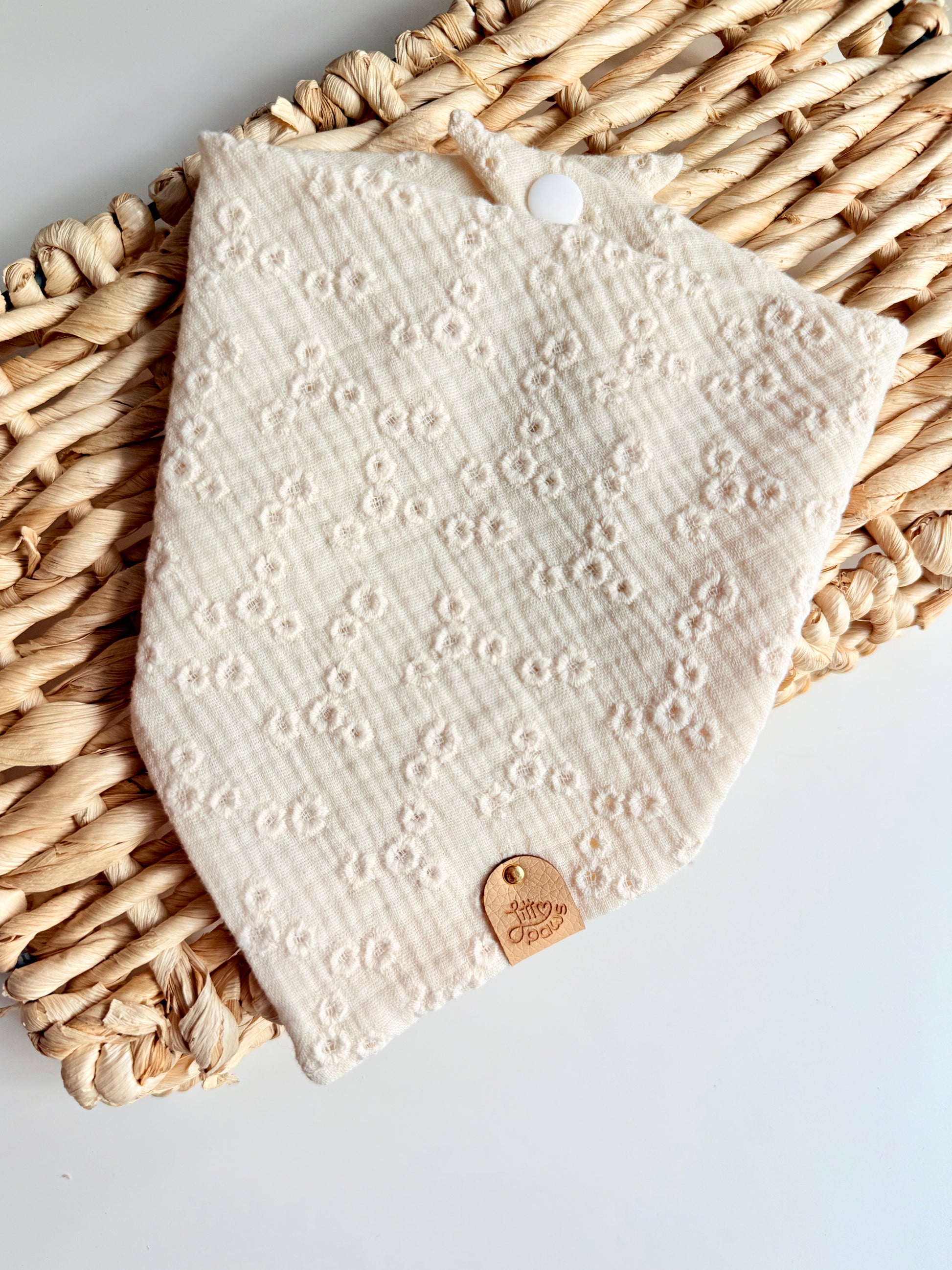 This cream dog bandana features delicate embroidered flowers on a lightweight muslin fabric for the sweetest, effortless look.